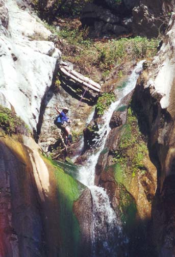 About 1hr 15min after reaching the canyon bottom and 4hr 15min from the start of the hike, you arrive at the top of the first major obstacle at an elevation of 2690ft. It is a three stage waterfall in a narrow slot. There is no convenient anchor other than the large and strangely distorted tree that bridges the slot high above the lip. To reach this tree and use it as the rappel anchor you need to back up, climb the dirt slope on the right and then descend to the tree down a steep slope. From this tree It is a 50ft rappel to the shallow pool at the bottom of the third cascade. Beyond this obstacle the easy going resumes and between here and the big falls there is only one minor problem, namely an awkward 6ft waterfall at 2210ft that needs careful climbing around to the right.